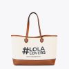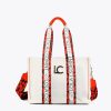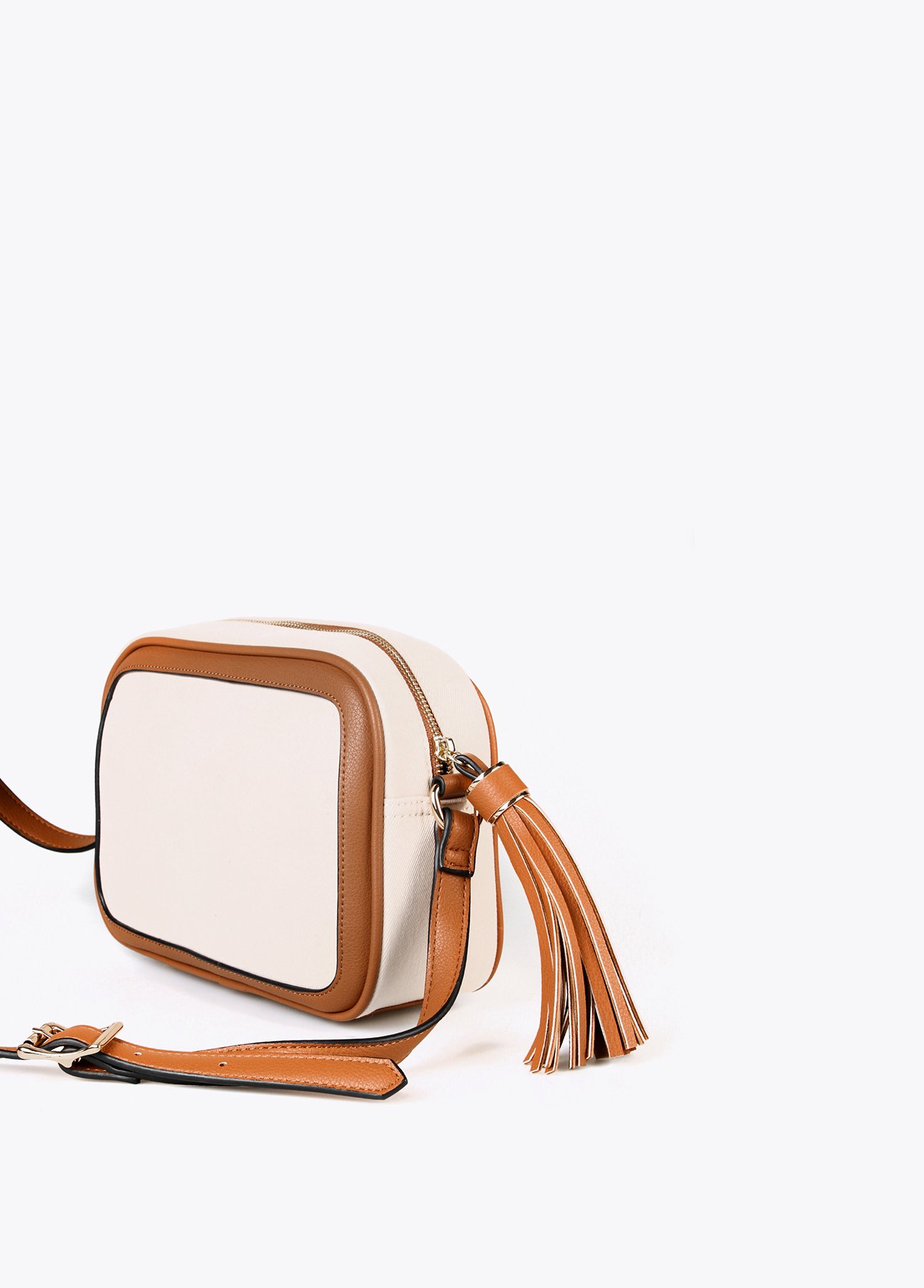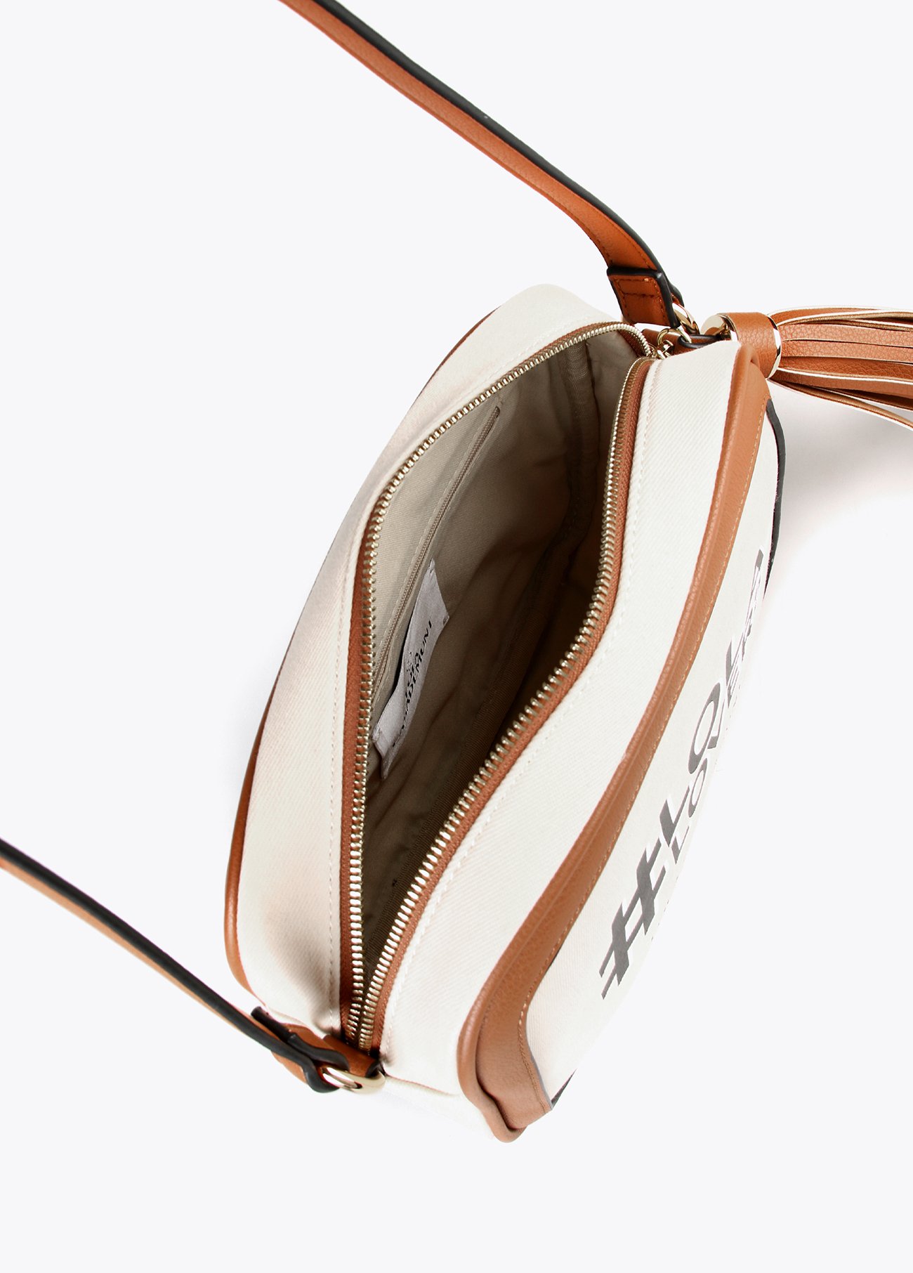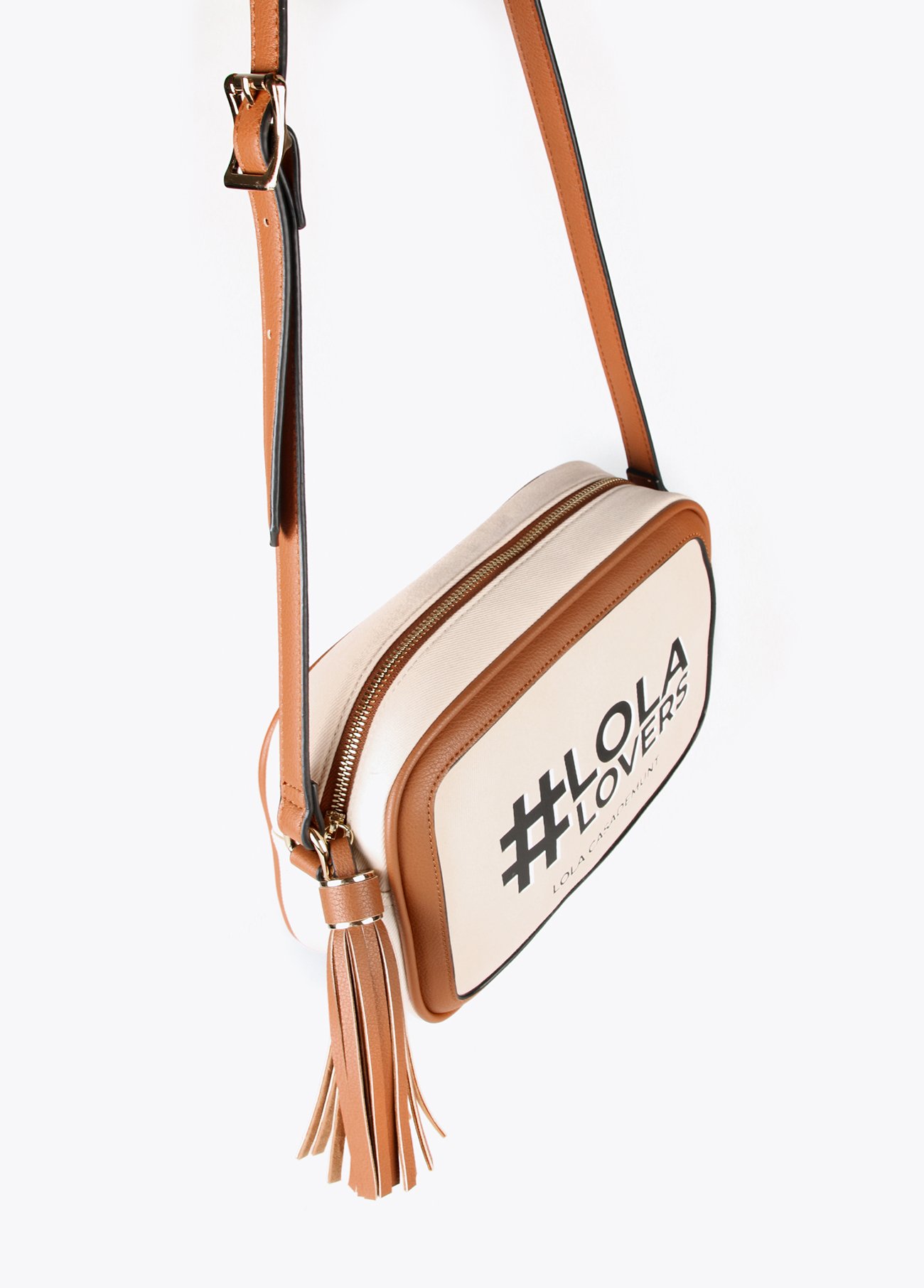 Bandolera de loneta en color crudo. Posicionado letras a contraste en negro. Detalle de fleco en camel.