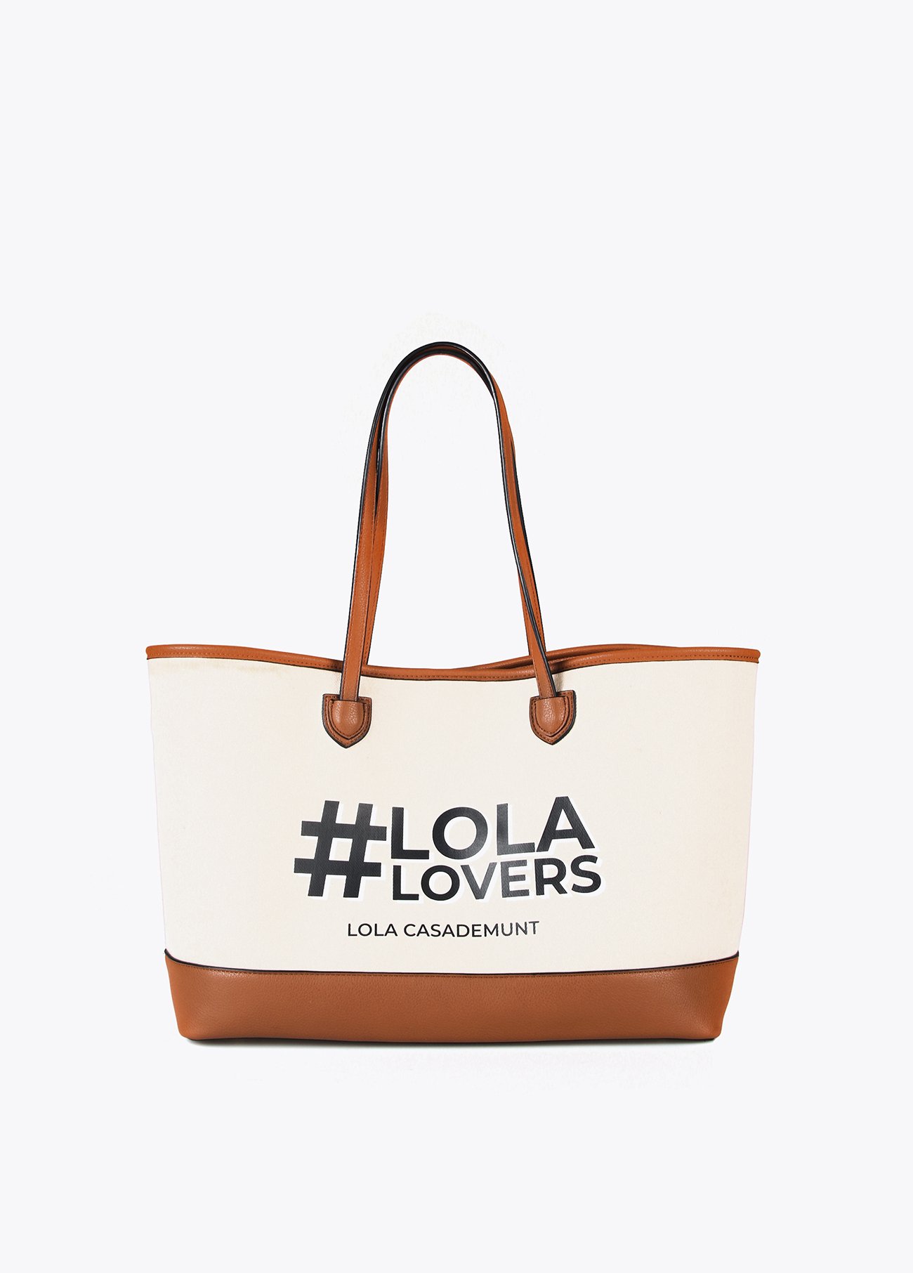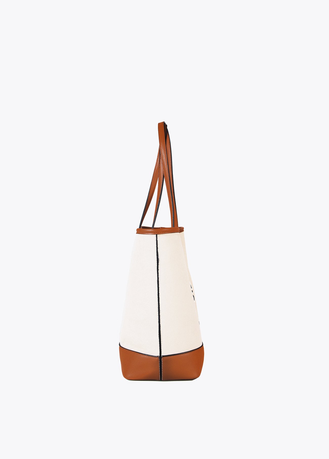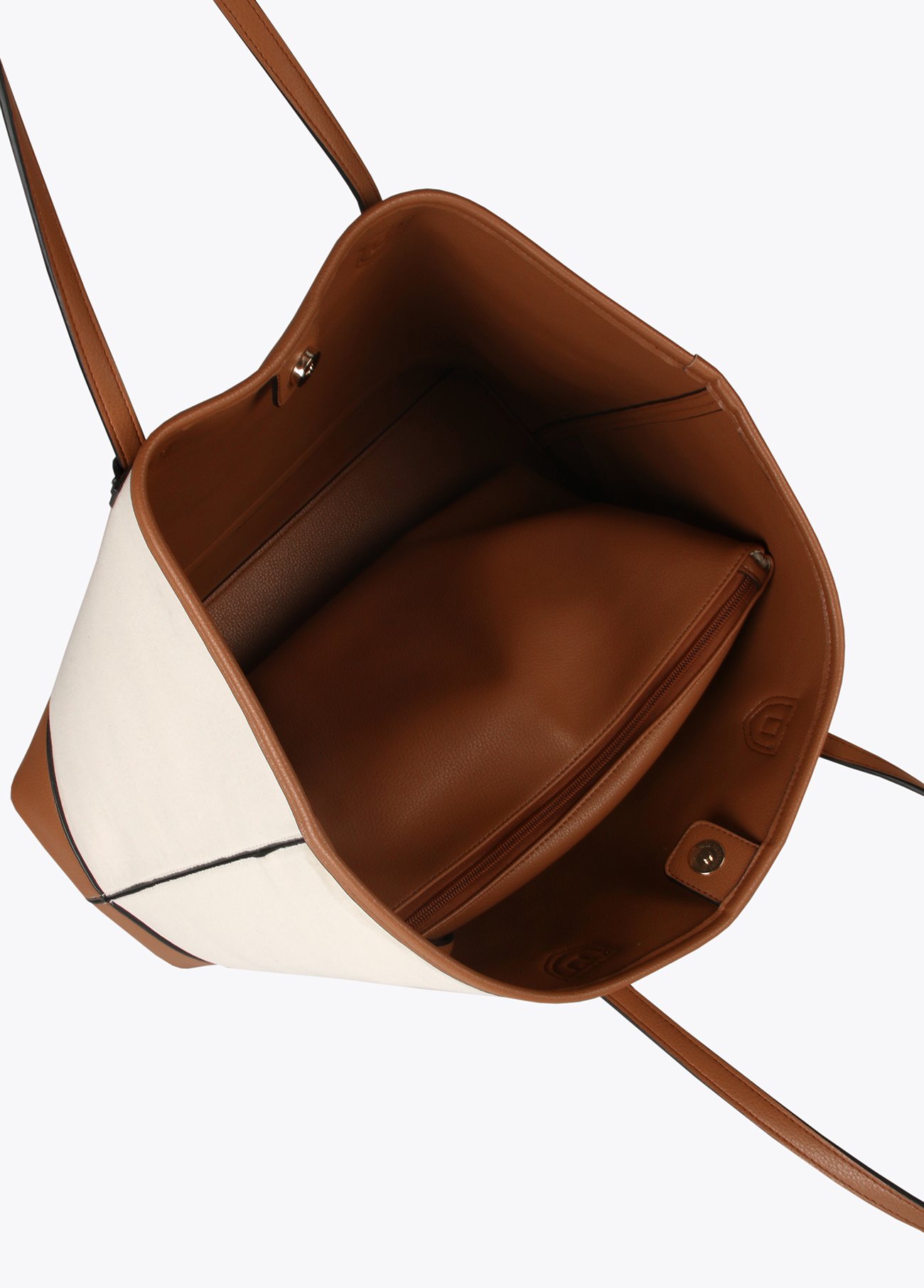 Bolso loneta en color crudo con posicionado negro. Detalle efecto piel en camel. Bolso interior con cierre en cremallera.