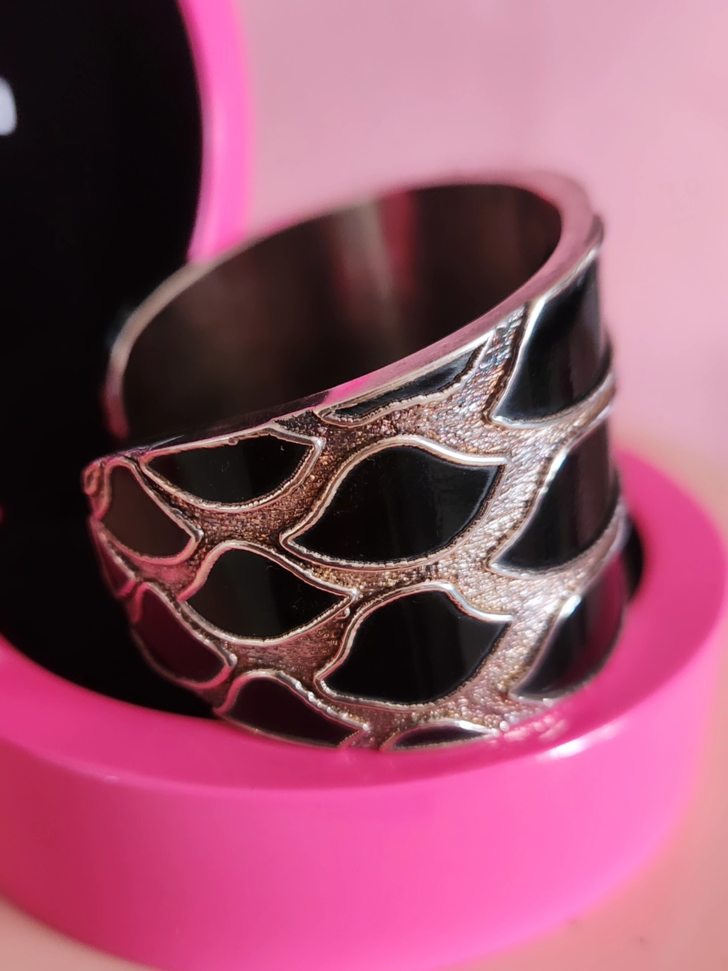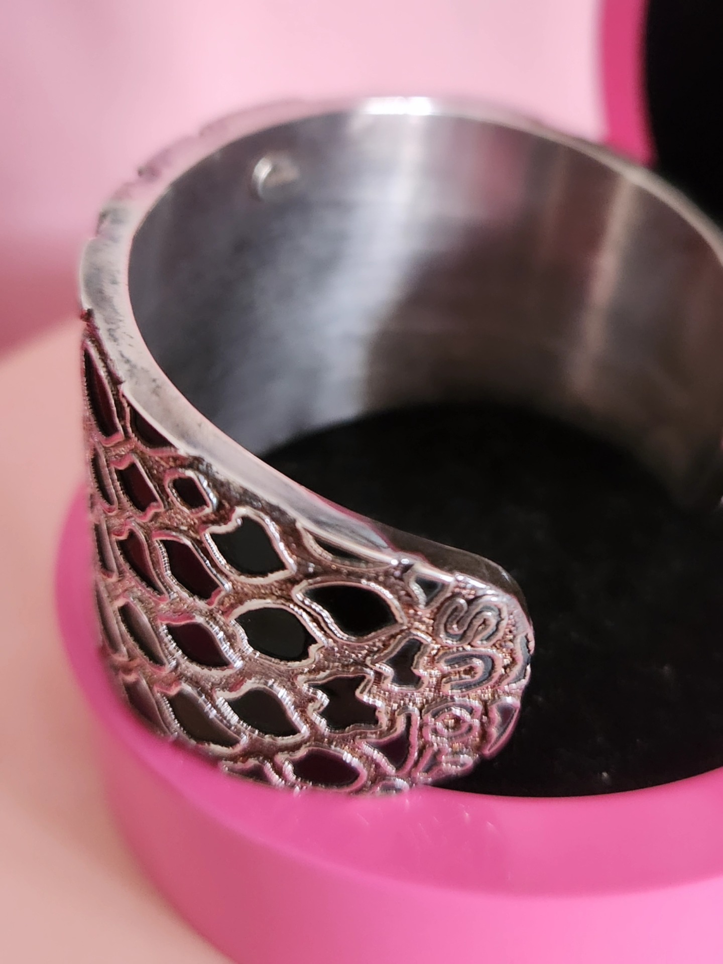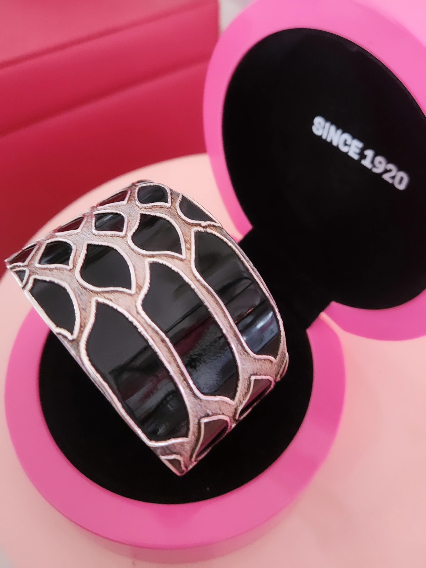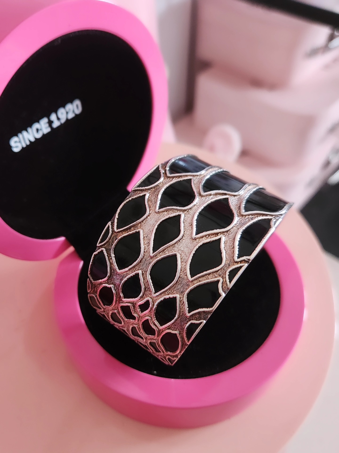 Compuesto por brazalete modelo Xl Bengalí, plata y metacrilato negro.
