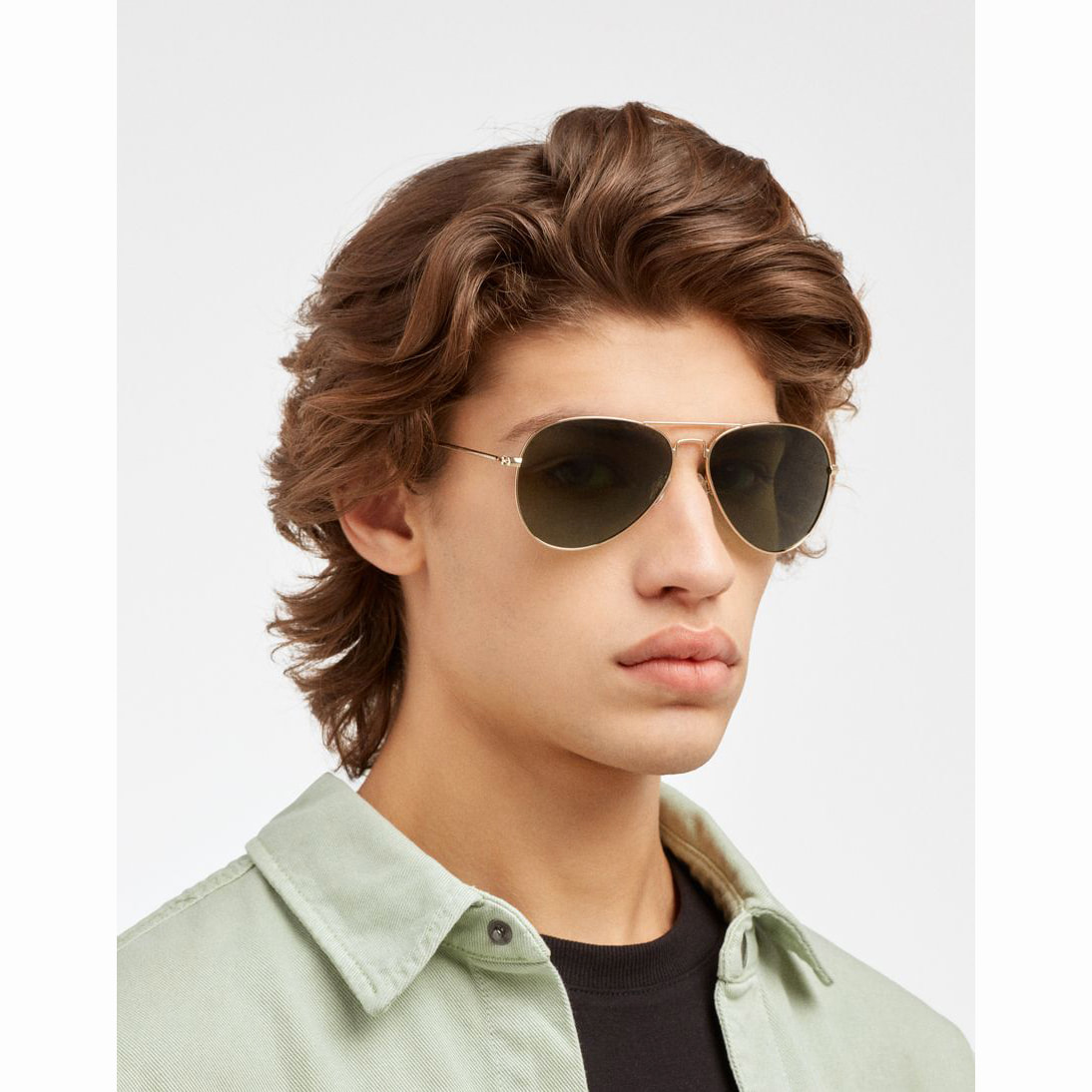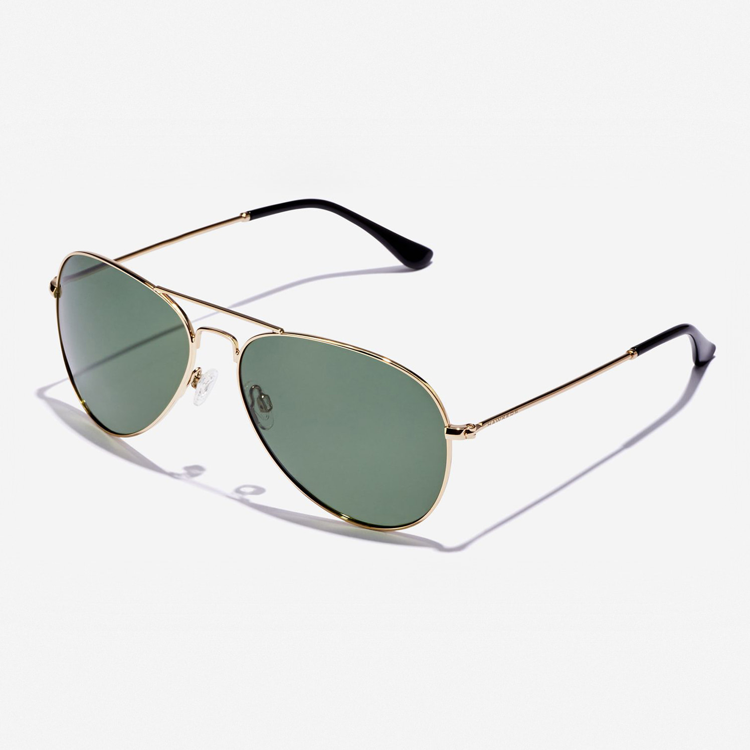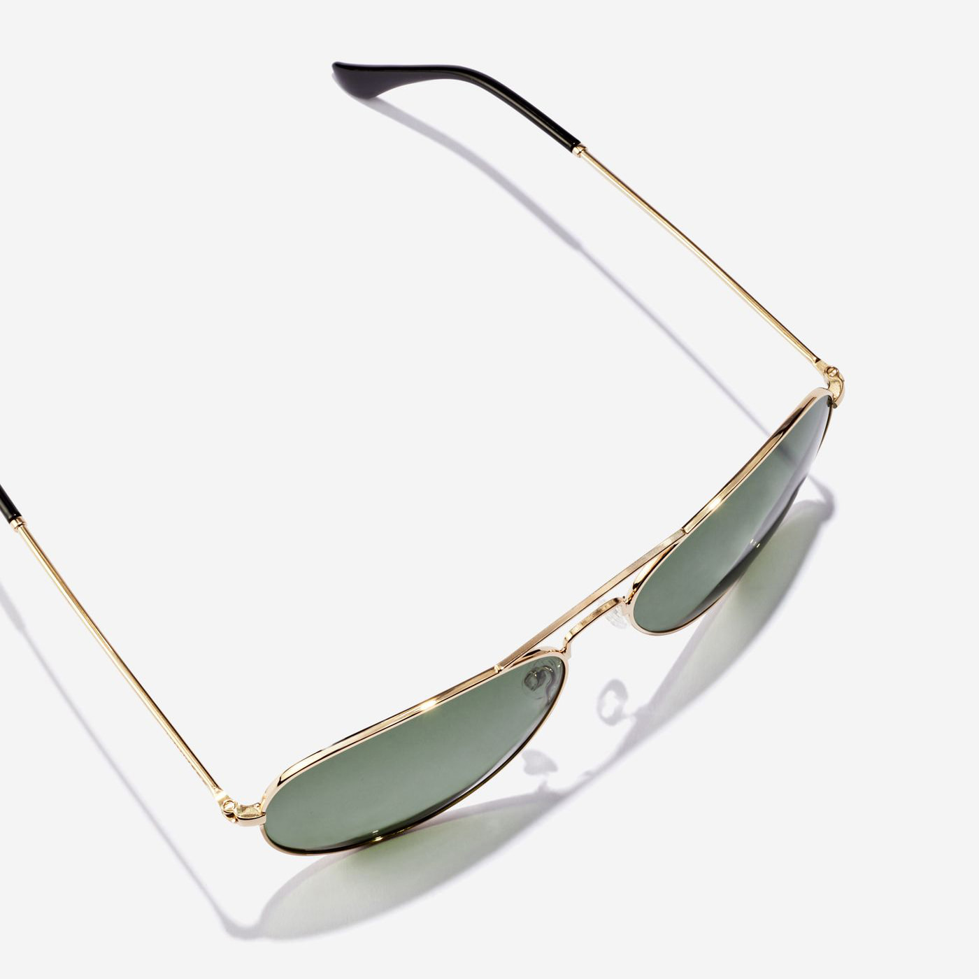 Un diseño clásico de doble puente de aviador en acero inoxidable dorado brillante, con lentes verdes polarizadas y terminales negros pulidos.
