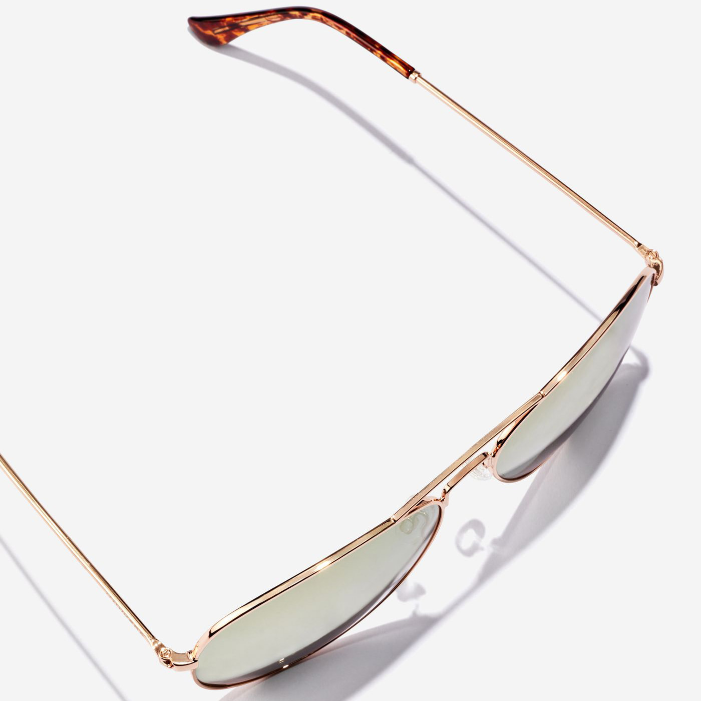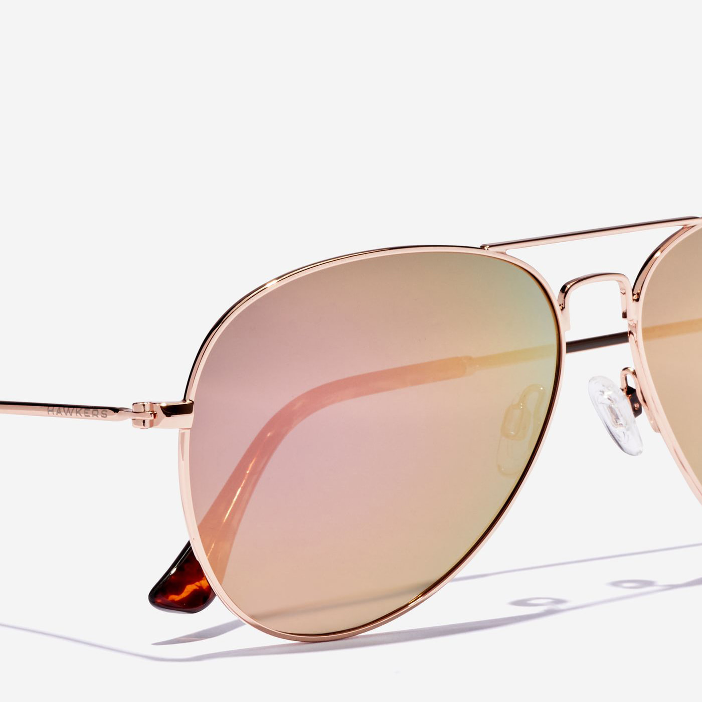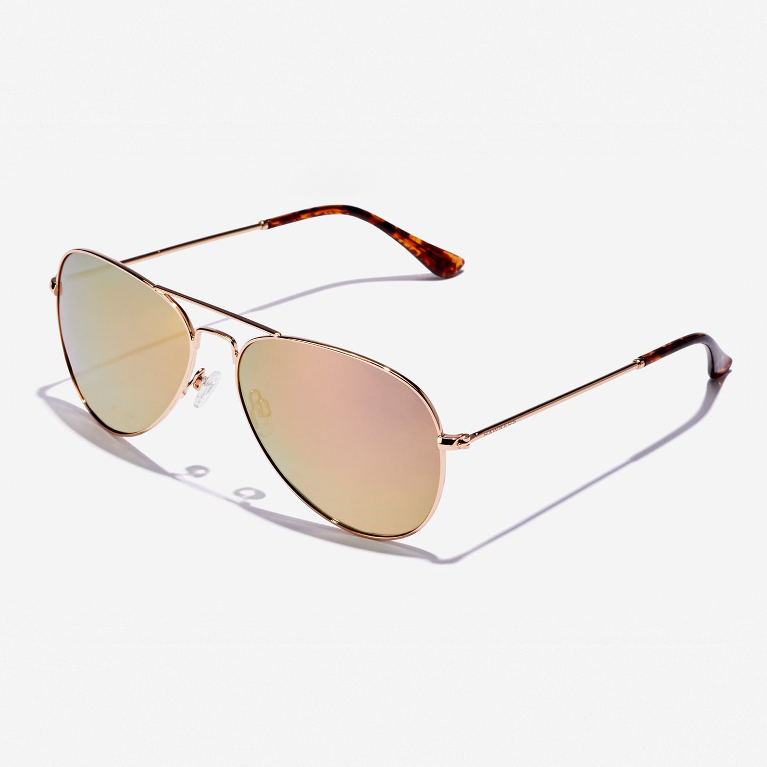 Un diseño clásico de doble puente de aviador en acero inoxidable brillante de color oro rosa, con lentes rosas polarizadas, espejadas y terminales de carey pulidos.