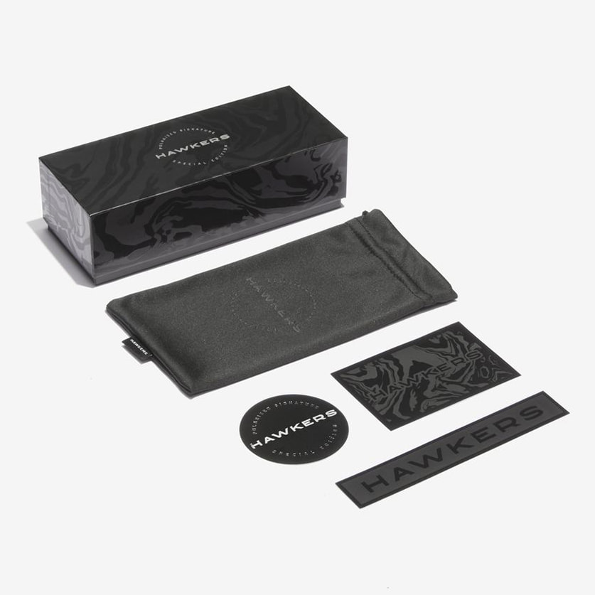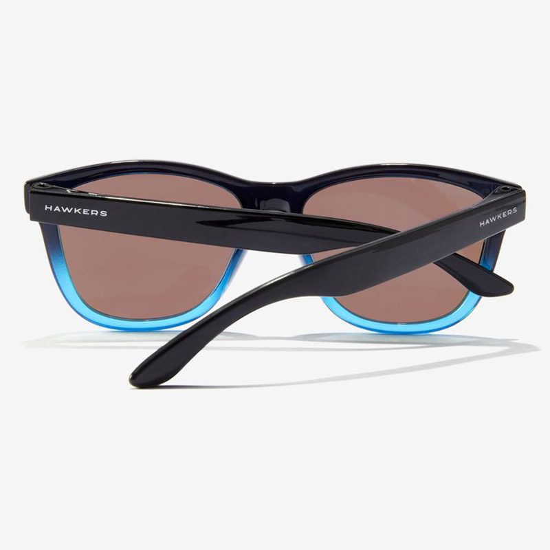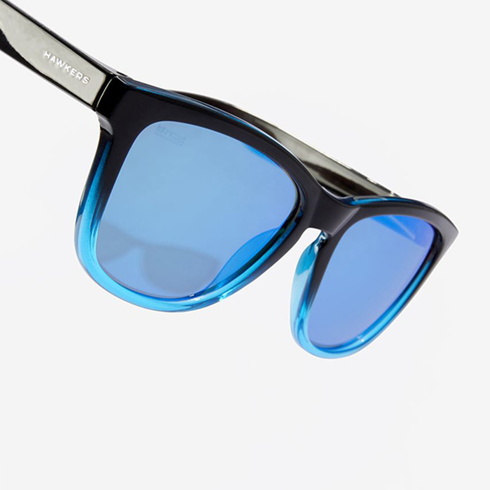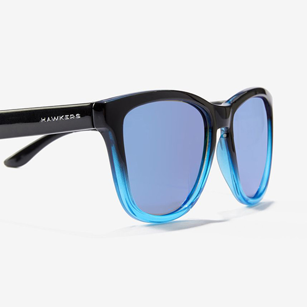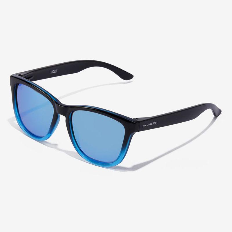 Esta versión polarizada de nuestro icónico modelo ONE, el más vendido de todos los tiempos, se presenta con patillas, puente y aros superiores negros brillantes, que se funden con aros inferiores azul claro translúcido, que se combinan con lentes azul claro espejadas.