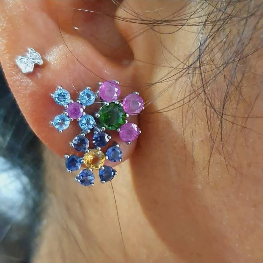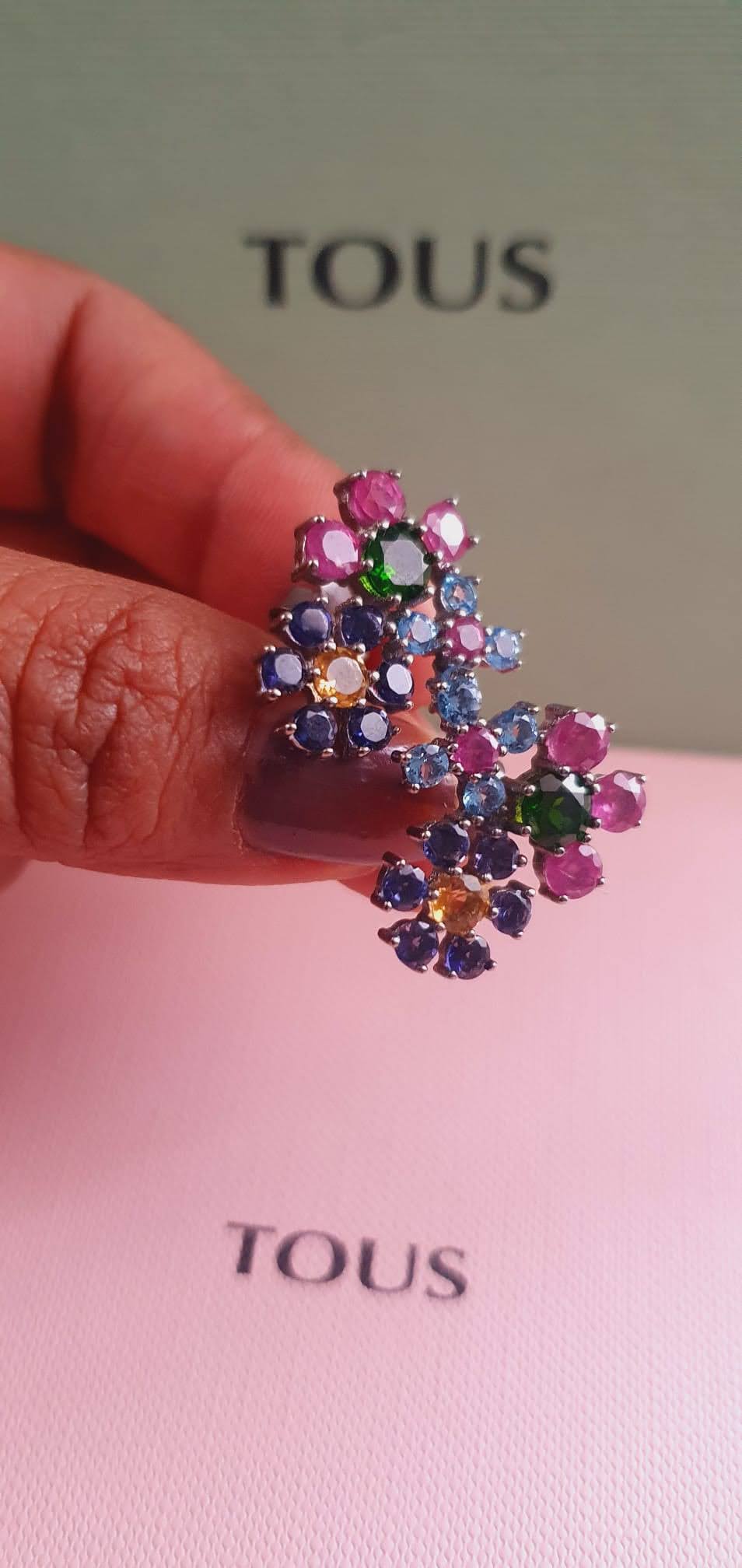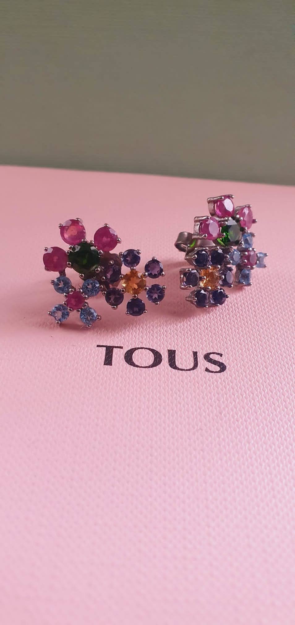Pendientes TOUS Real Sisy de titanio con tres rosetones de citrino, iolita, cromodiopsido, rubí tratado y topacio azul. Cierre presión. Motivo: 2 cm