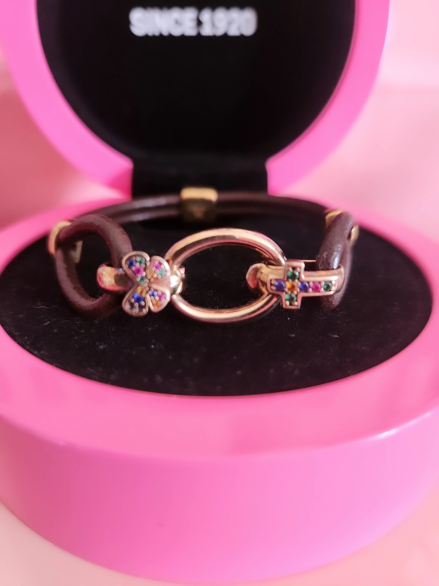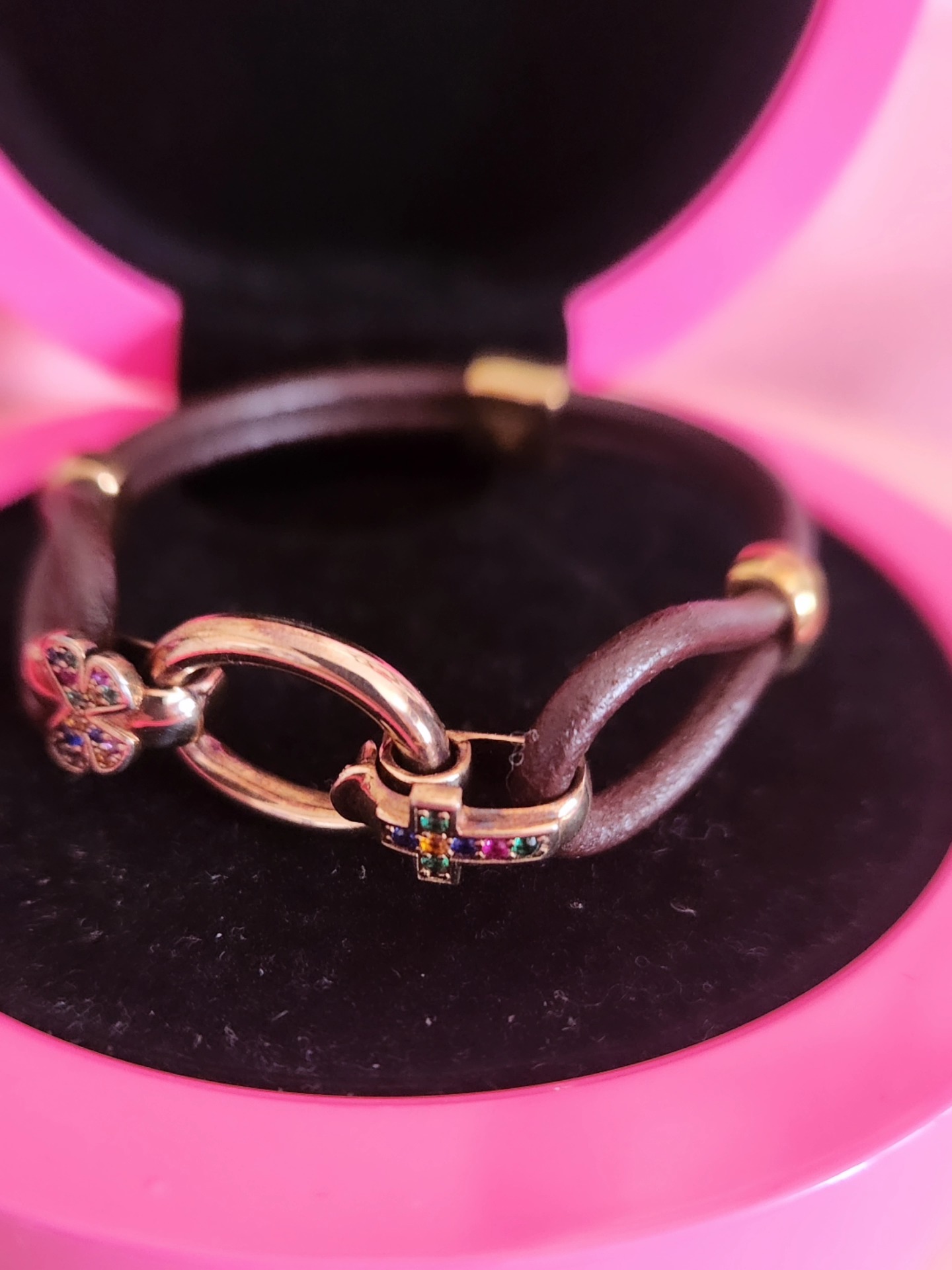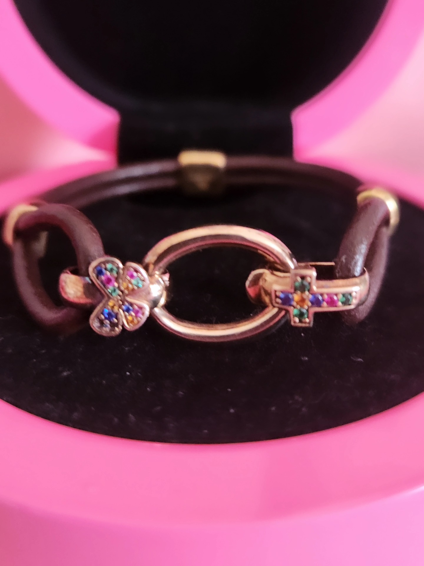 Pulsera plata bañada en oro 18k y zafiros y correa piel.