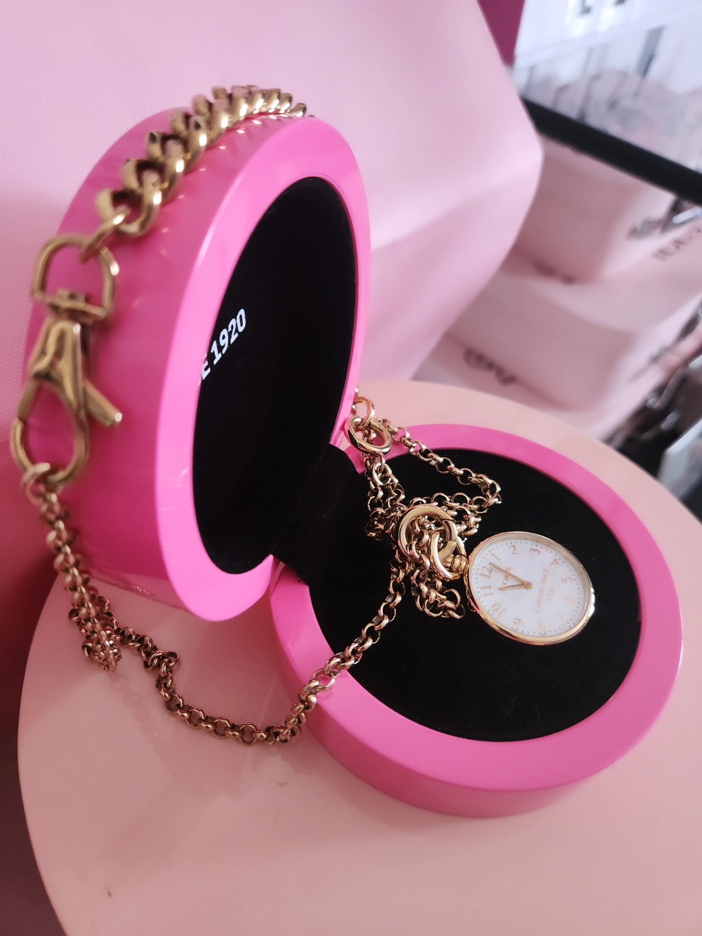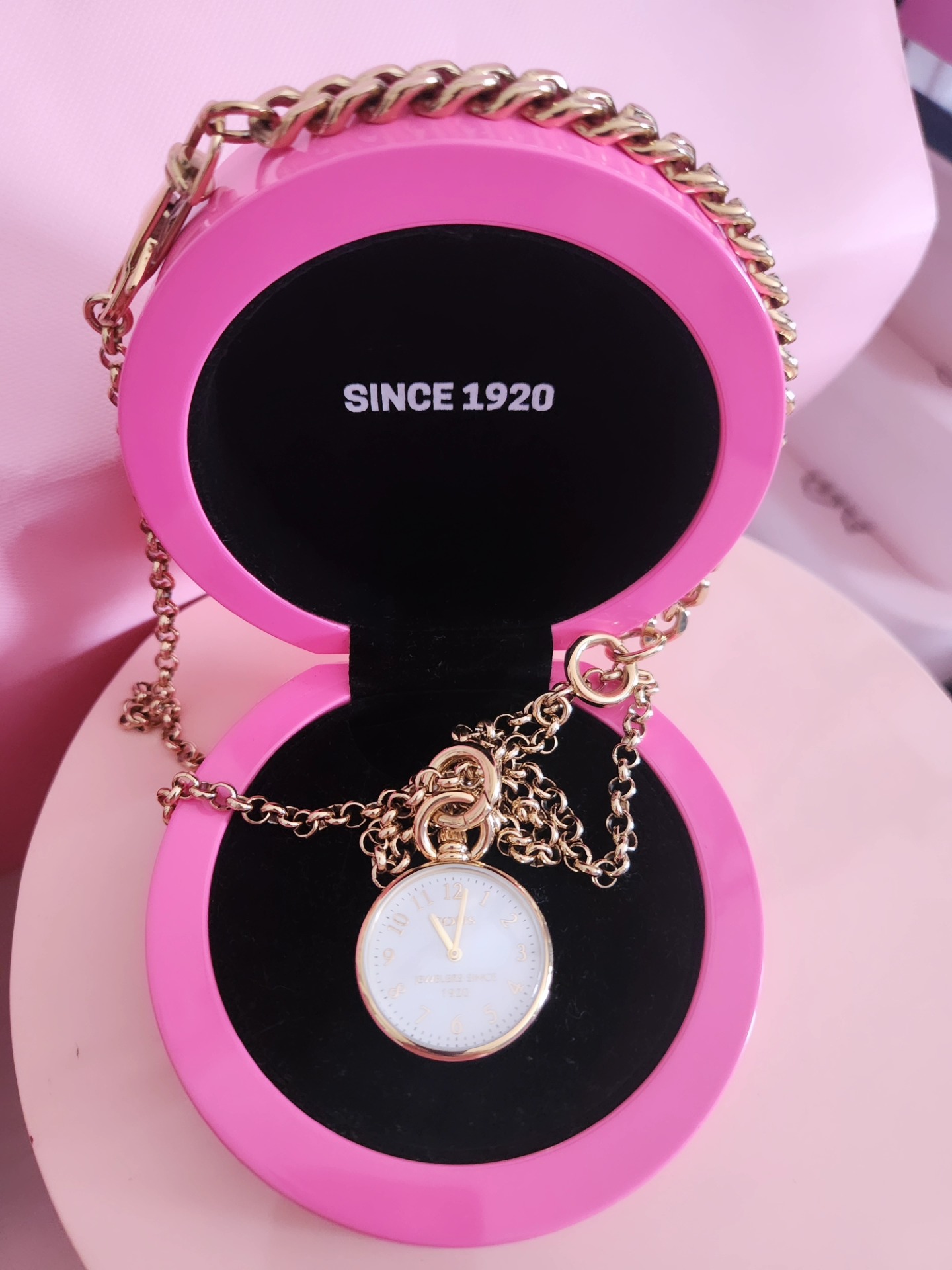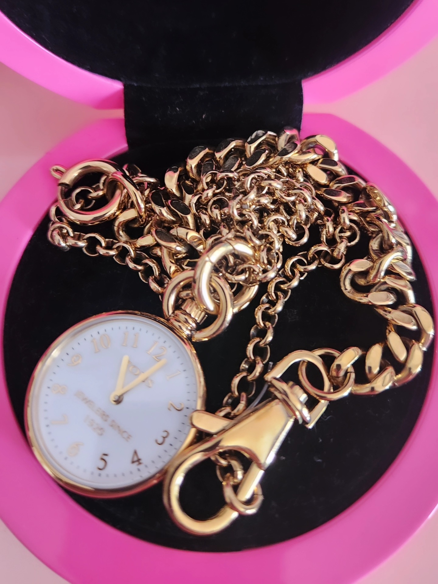 Reloj de bolsillo Job acero ip dorado, para bolso o como collar, con cadena larga.
