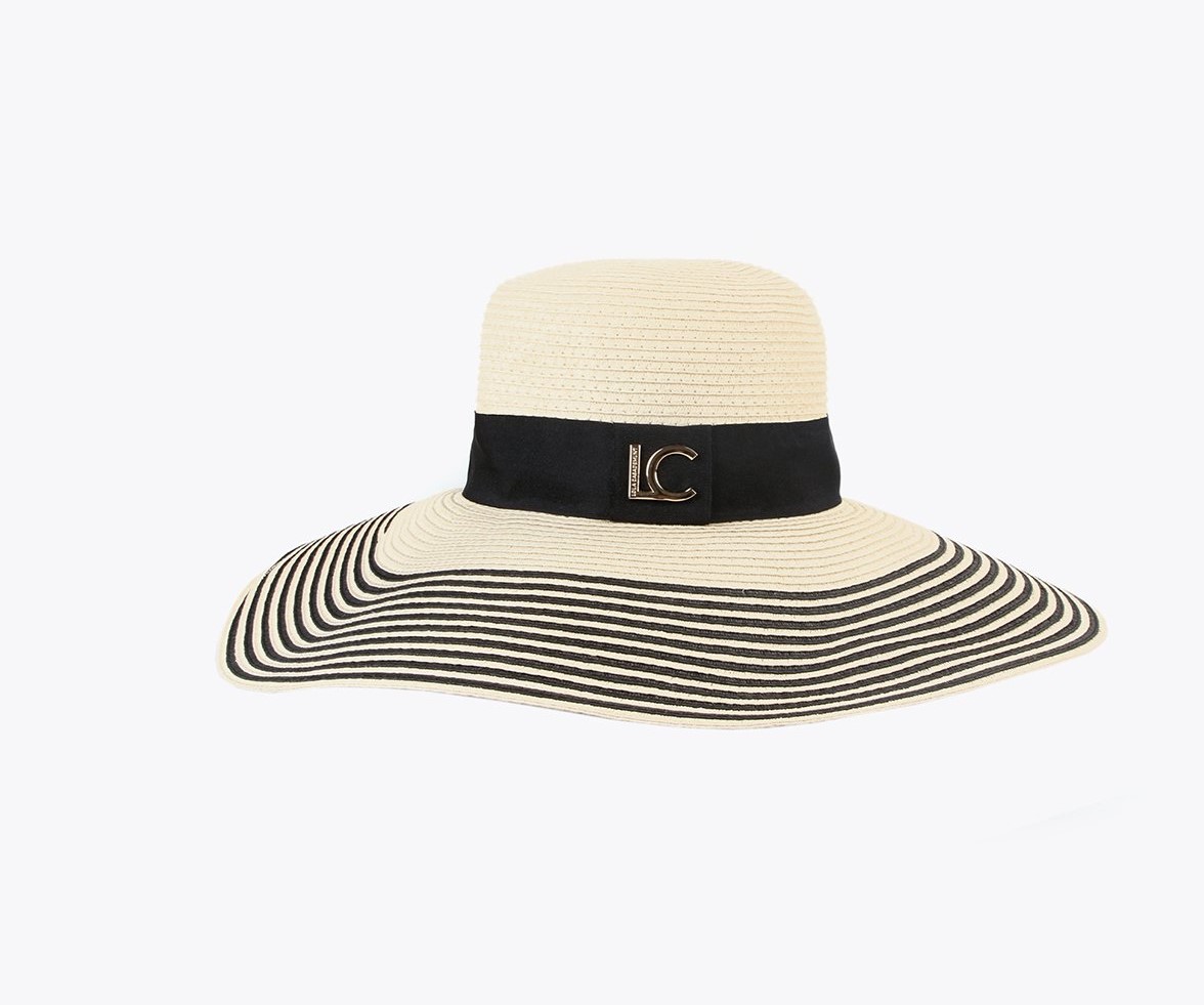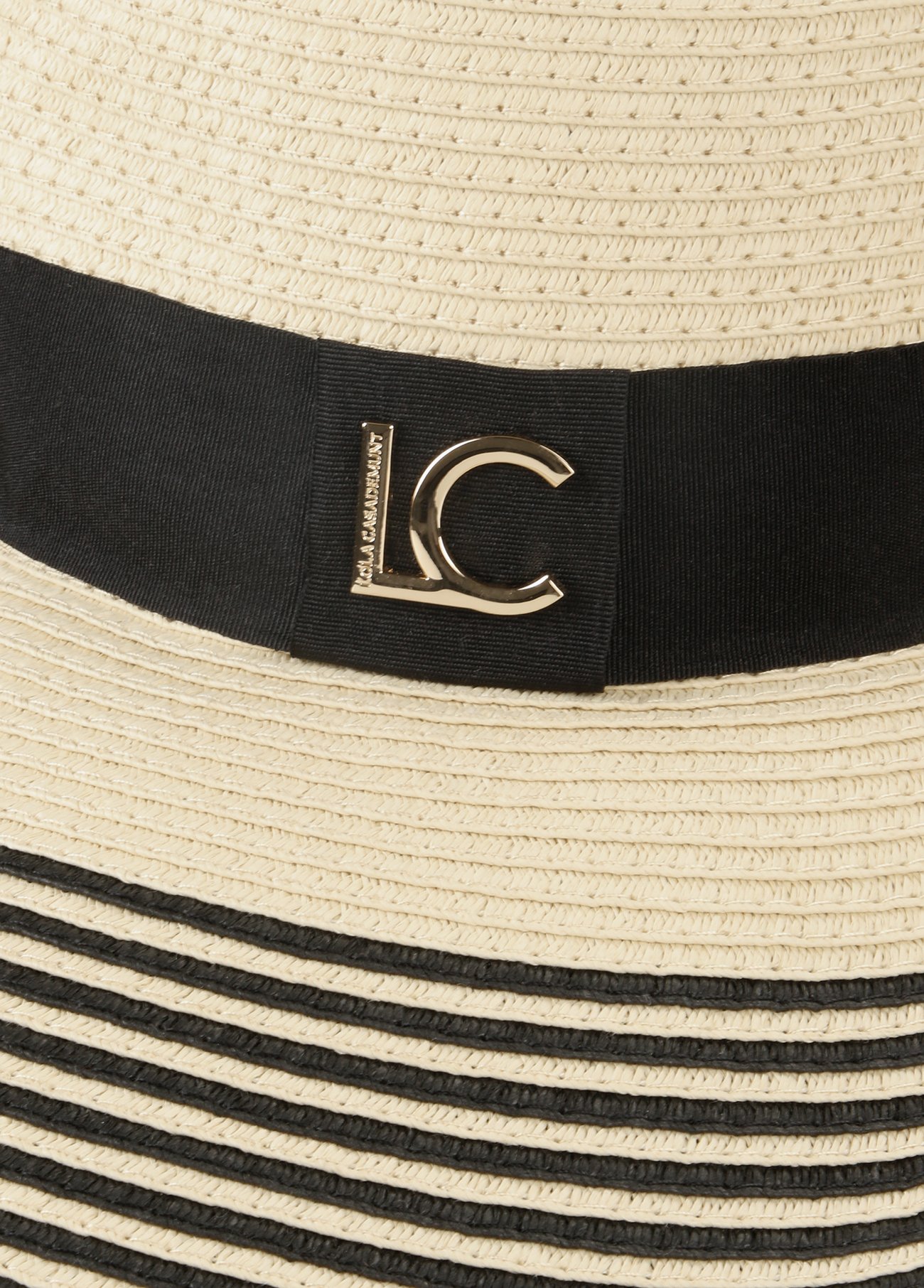 Pamela de rafia bicolor con rayas en la parte de la visera y cinta con letras logo en metal dorado.